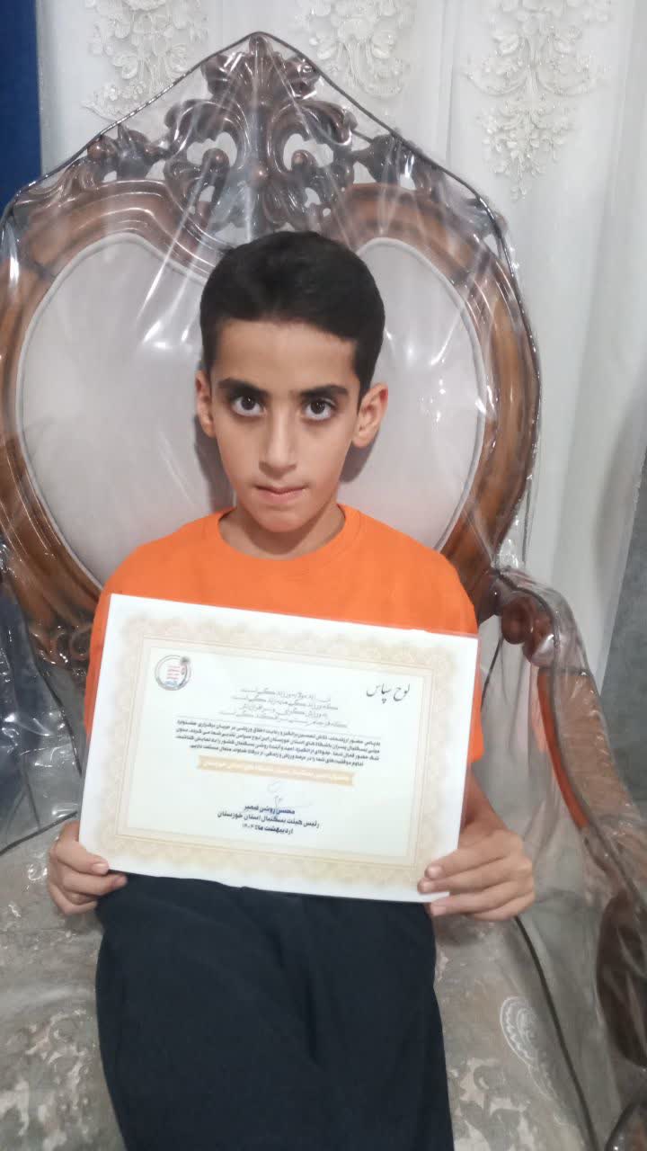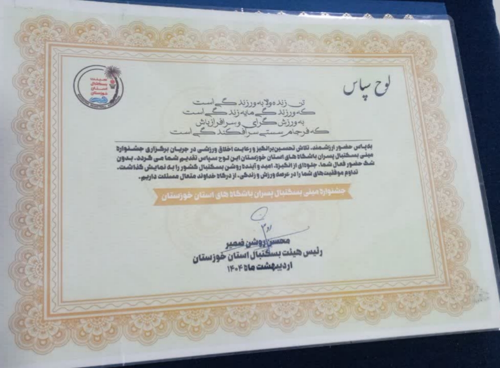 آقا مهزیار عزیز و دوستداشتنی، هم دانشآموز ممتاز مدرسه بهار آزدی است، و هم به ورزش بسکتبال علاقمند است و از طرف رئیس هیئت بسکتبال استان خوزستان لوح سپاس دریافت نموده است.