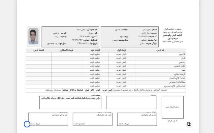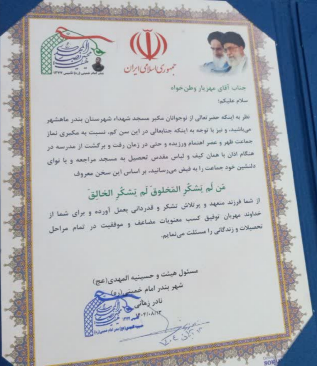 آقای مهزیار وطنخواه در روز ۱۳ آبان ۱۴۰۴ که مصادف با روز دانش آموز و سالروز شهادت حضرت زهرا سلام الله علیها که یکی از بزرگترین الگوهای تعهد، تدین و وفاداری میباشند، لوح تقدیر خود را دریافت نمودند.