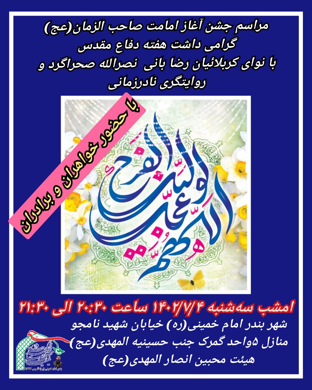 هیئت محبین انصار المهدی(عج) شهر بندر امام خمینی(ره) سهشنبه ١۴٠٢/٧/۴ از ساعت ٢٠:٣٠ الی ٢١:٣٠ مراسم جشن آغاز امامت صاحب الزمان(عج) و گرامی داشت هفته دفاع مقدس با حضور خواهران و برادران، و نوای گرم و دلنشین کربلاییان رضا بانی و نصرالله صحراگرد، همراه با خاطرات جبهه و جنگ به روایتگری نادر زمانی برگزار نمود.
