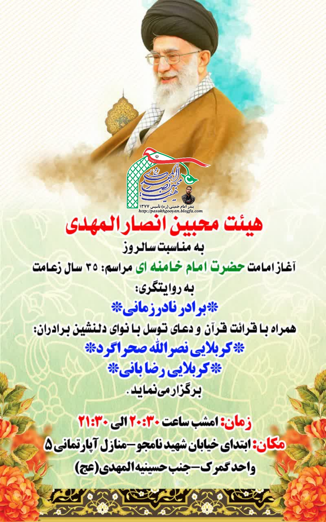 هیئت محبین انصار المهدی حسینیه المهدی(ره) بندر امام خمینی(ره) به مناسبت سالروز ارتحال حضرت امام خمینی و سالروز آغاز امامت امام خامنهای مراسم "٣۵سال زعامت" با روایتگری برادر نادرزمانی برگزار نمود.