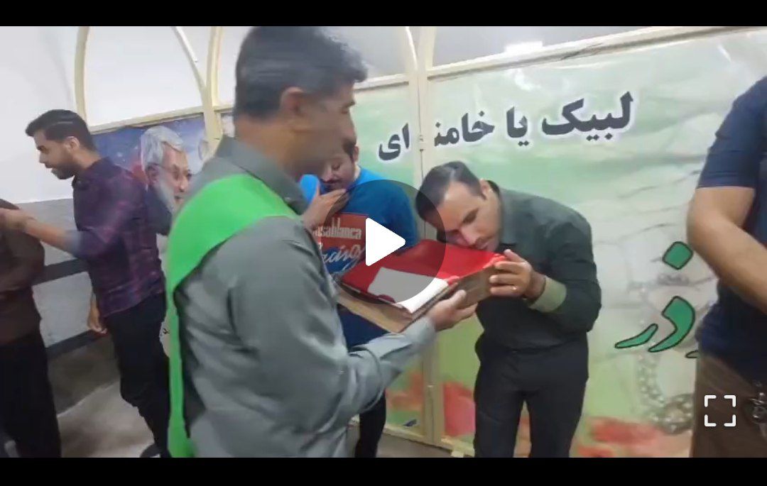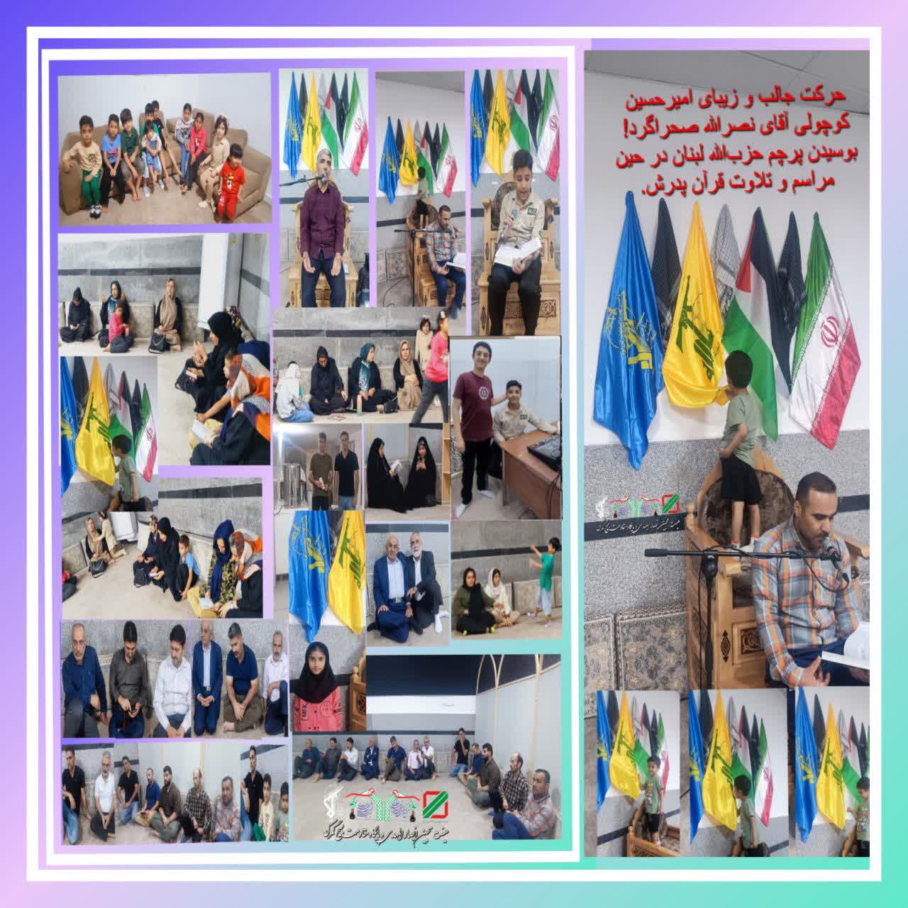 بوسیدن پرچم حزبالله لبنان در مراسم هیئت محبین انصار المهدی(عج) و حین تلاوت قرآن مجید توسط پدرش.