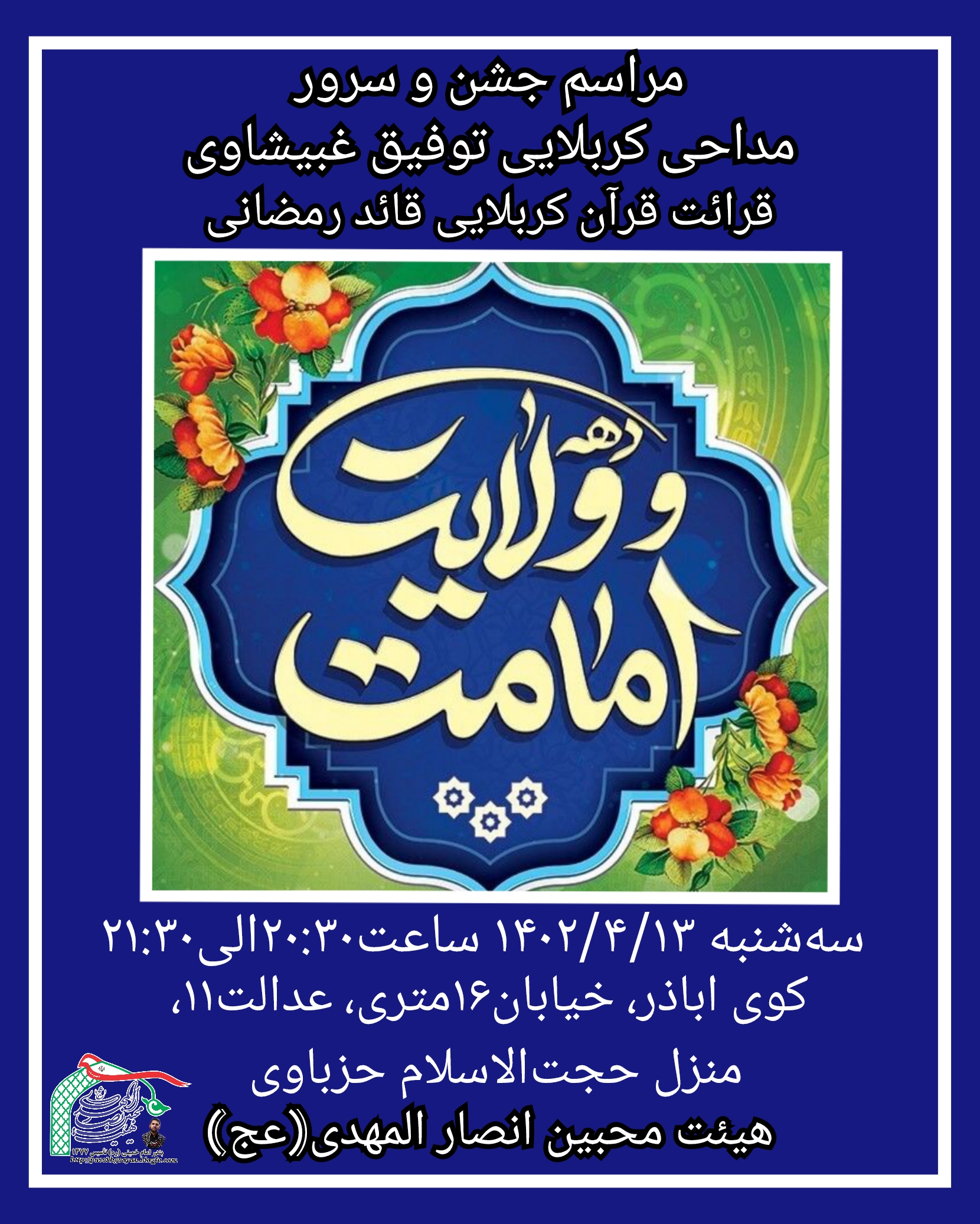 مراسم جشن و سرور به مناسبت دهه مبارک امامت و ولایت با مداحی کربلایی توفیق غبیشاوی و قرائت قرآن کربلایی علیرضا قائد رمضانی.