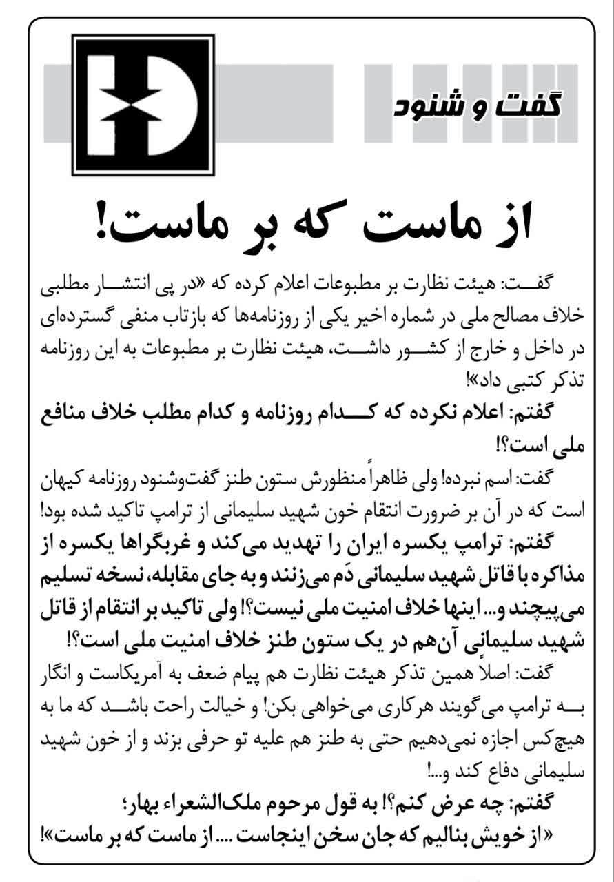 🔸انتشار مطلبی در ستون طنز گفتوشنود کیهان درباره انتقام و قصاص ترامپ و عدم فراموشکاری ایران در رابطه با جنایت ترور شهید سلیمانی، با بازتابی گسترده همراه شد، در این میان طیف غربگرای داخلی در موضعی عجیب کیهان را هدف حملات خود قرار داده است. حملهای که بیشتر از کیهان، هموارسازی مسیر مذاکره ذلیلانه و باجدهی به آمریکا را در نظر دارد.