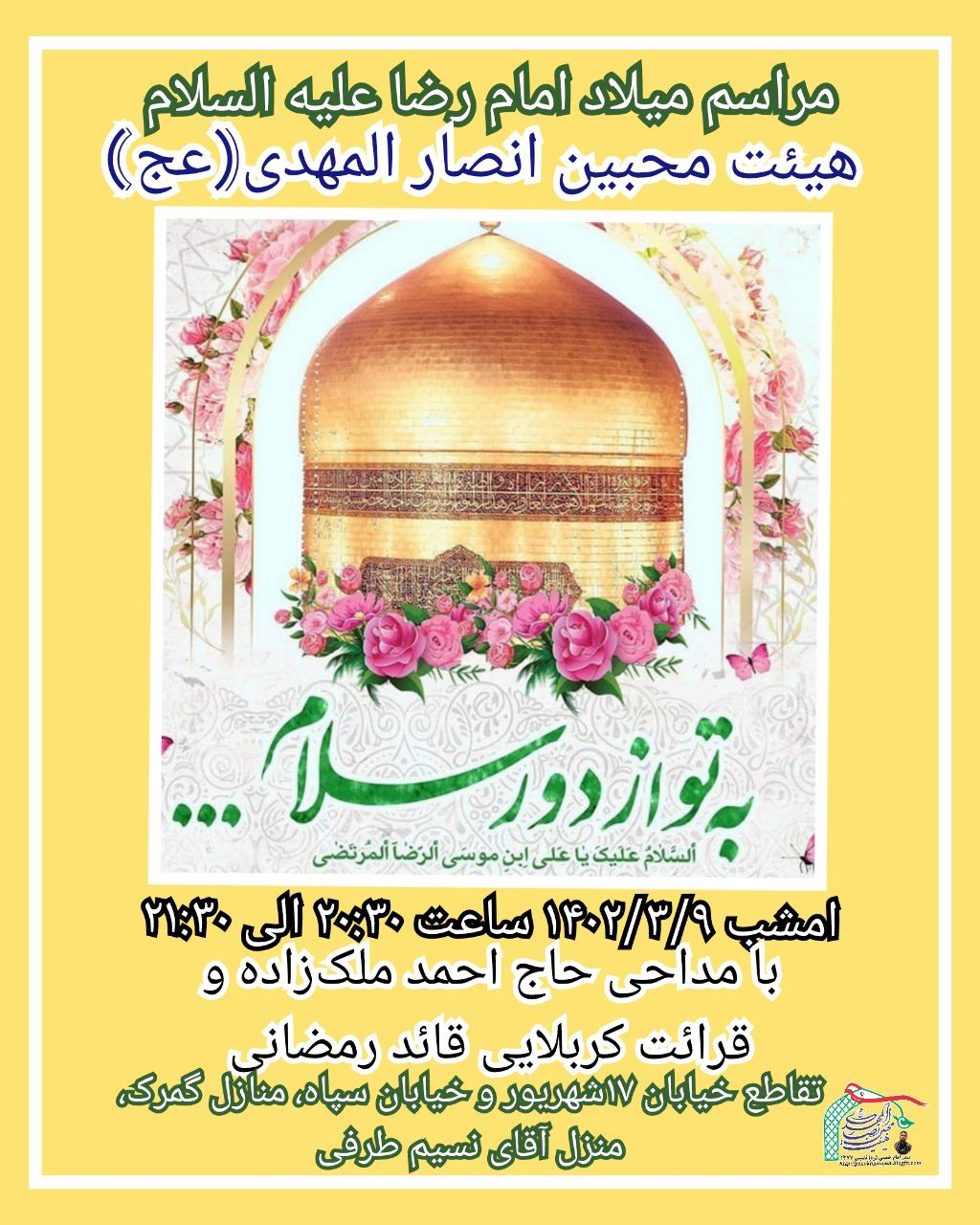 هیئت محبین انصار المهدی حسینیه المهدی(عج) بندر امام خمینی(ره) سهشنبه شب مورخ ١۴٠٢/٣/٩ به مناسبت دهه کرامت مراسم جشن میلاد امام رضا علیه السلام با مداحی حاج احمد ملکزاده در منزل آقای نسیم طرفی برگزار نمود.