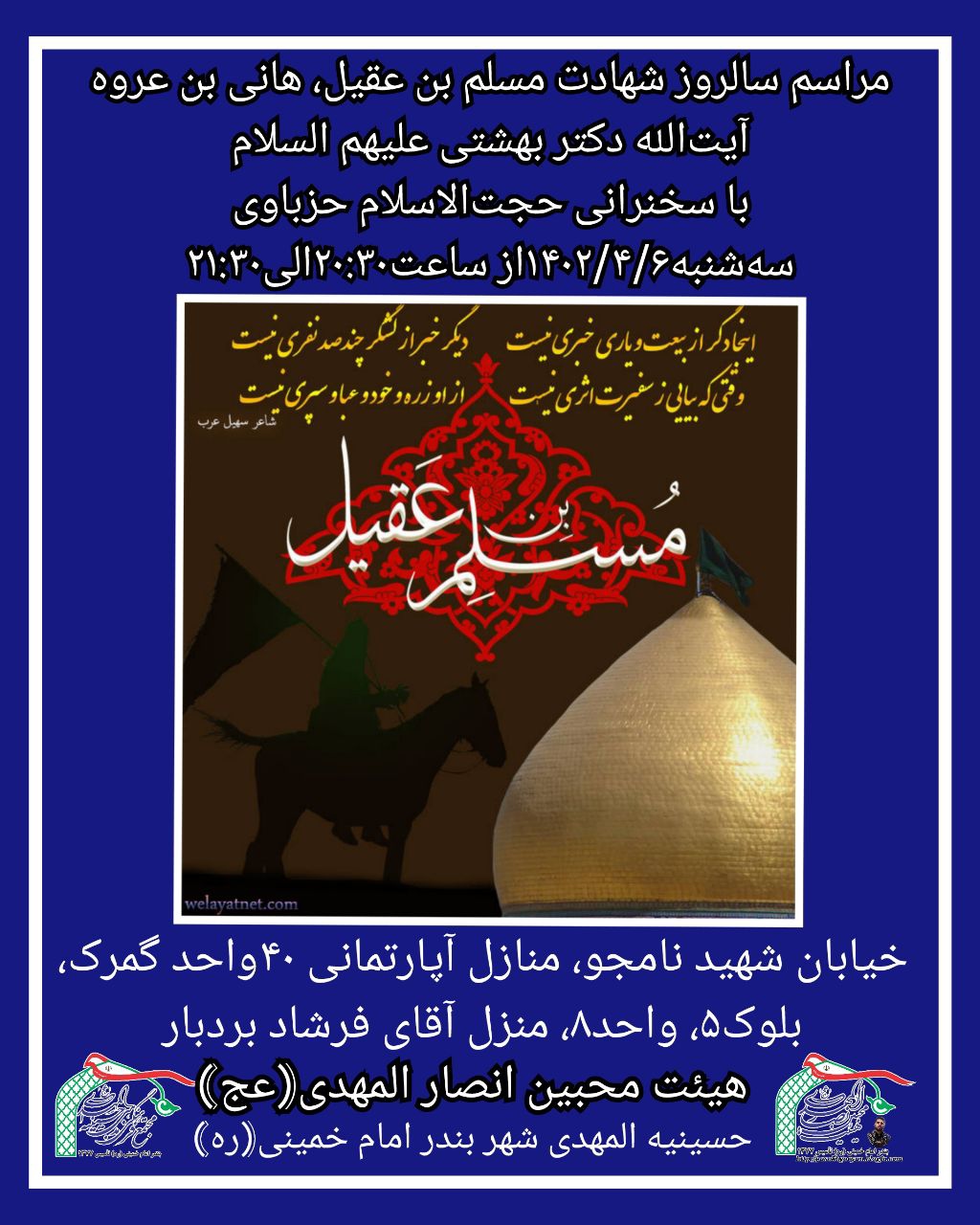 به مناسبت سالروز شهادت حضرات مسلم ابن عقیل، هانی ابن عروه و آیتالله دکتر بهشتی علیهم السلام برگزار میکند.